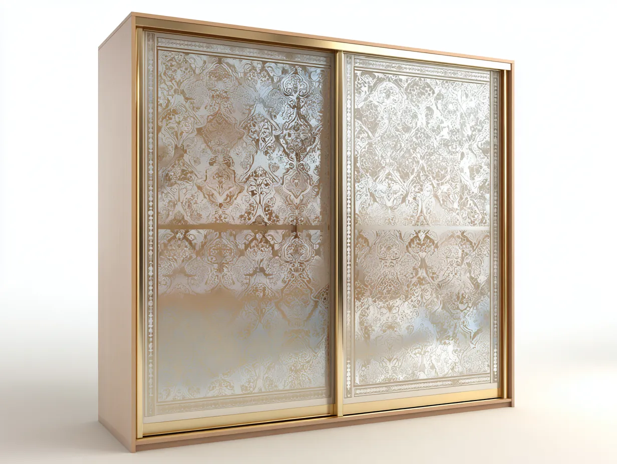 La structure est réalisée en bois avec une finition beige, associée à des portes en verre décoratif aux motifs travaillés et à des éléments dorés. L'ensemble présente une finition soignée adaptée à un usage intérieur.